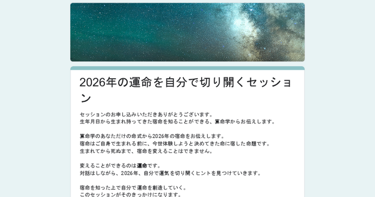 算命学には、生まれた時に自ら選んできた「宿命」が刻まれています。性格、考え方、人との関係性、得意な方向…。目には見えませんが、人生の基盤となる深いテーマです。 今回のセッションでは、2026年の年運と宿命をもとに、来年どの方向へ進むと流れが良いのか、何を手放すと軽くなるのかを整理します。 未来を占う場ではなく、「自分で未来を選べる状態になる」ための時間です。迷いが減り、選択が早くなり、行動が軽くなります。